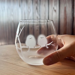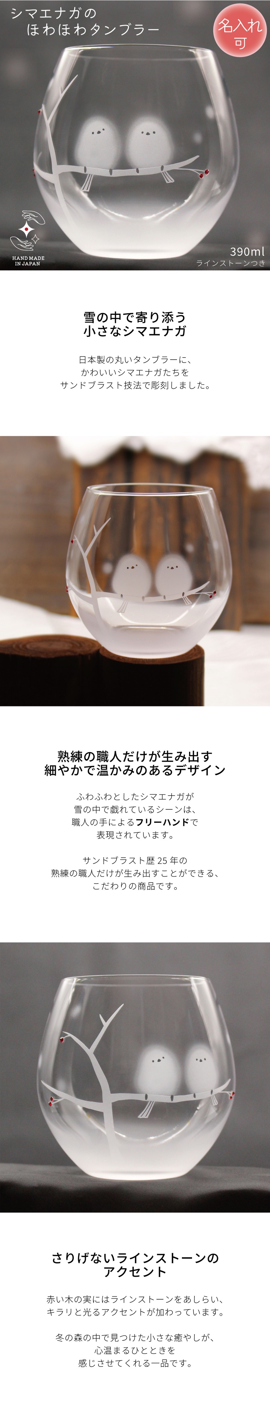 日本製の丸いフォルムが特徴のタンブラーに、ふんわりと可愛らしいシマエナガたちを、サンドブラスト技法で丁寧に彫刻しました。