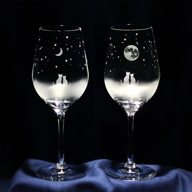 ティアドロップ形状のワイングラスに、三日月と満月の夜空を一緒にみているネコたちをサンドブラストで彫刻しました。