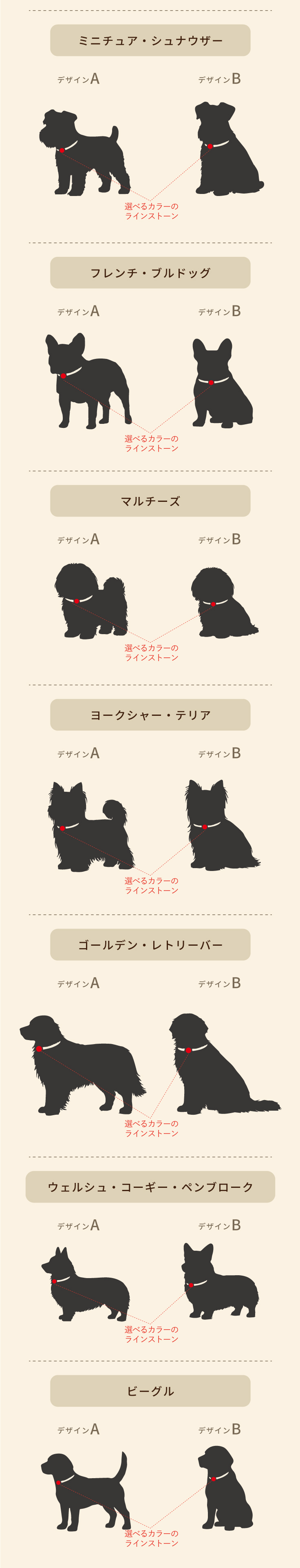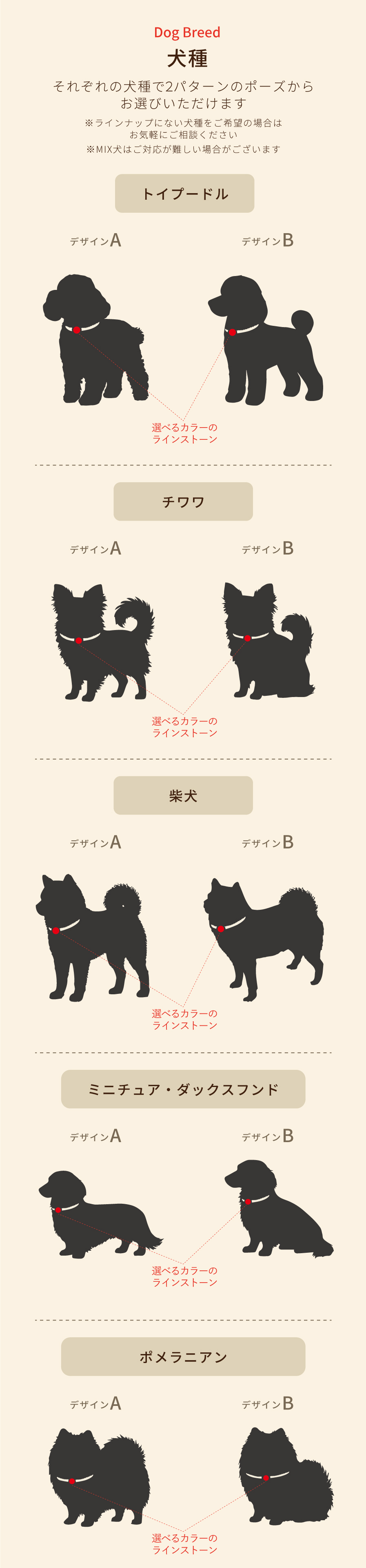 犬種、ポーズ、ラインストーンのカラー、