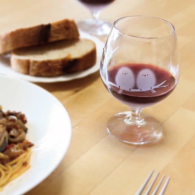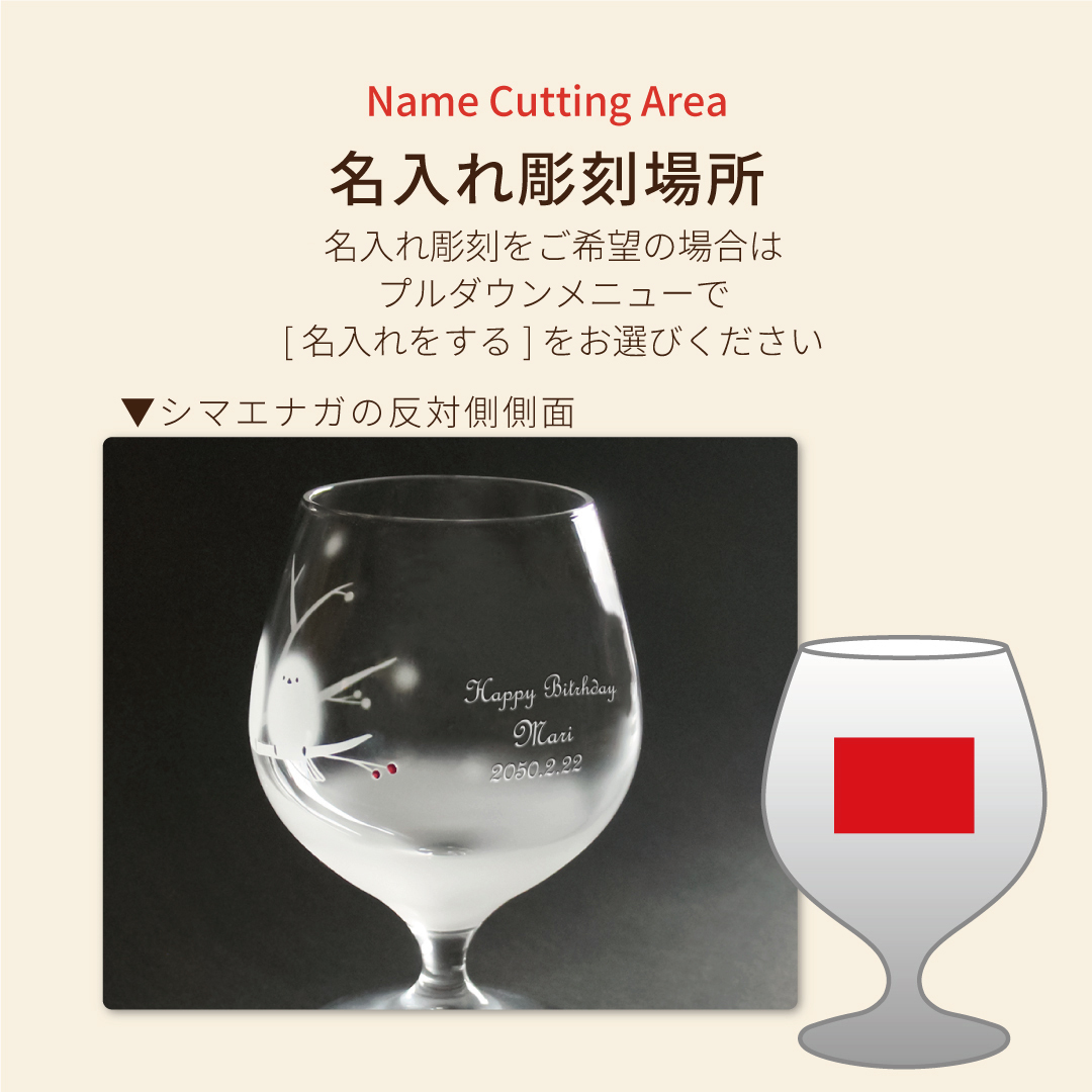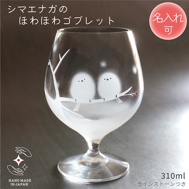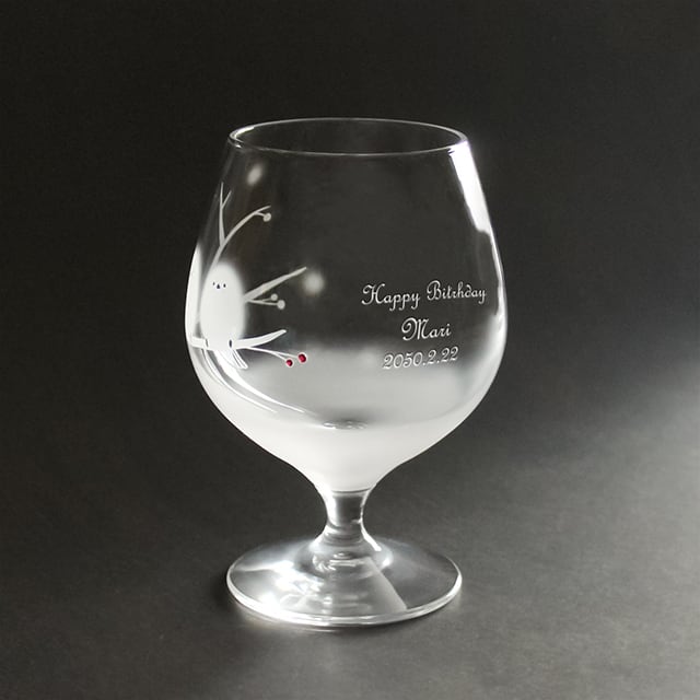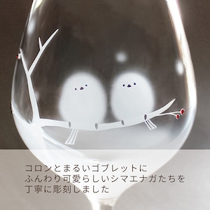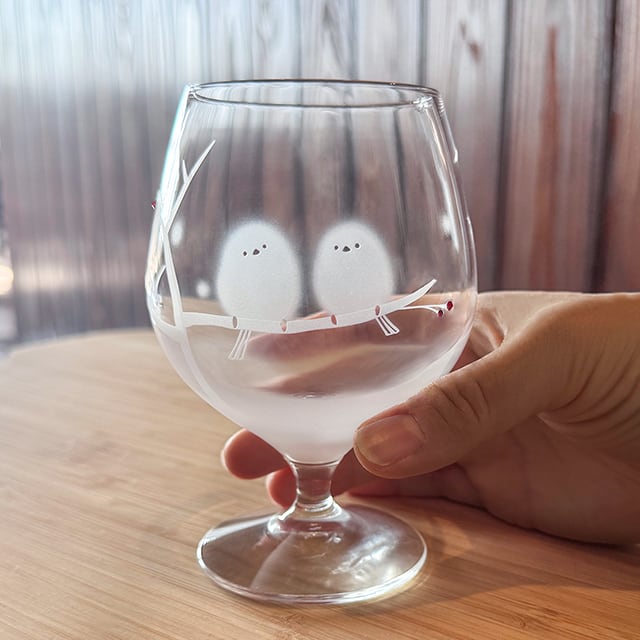 日本製のコロンと丸いゴブレットに、かわいいシマエナガたちをサンドブラスト技法で彫刻しました。