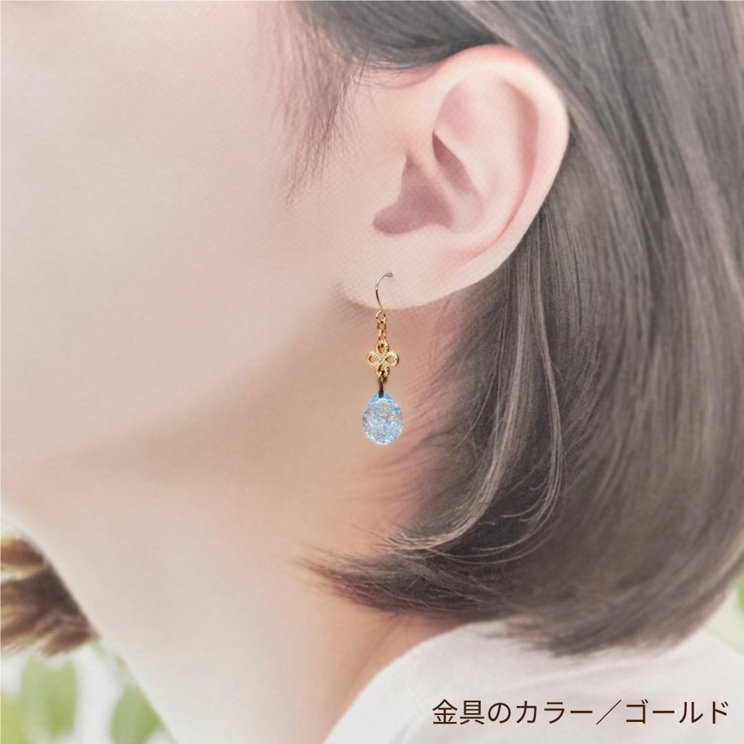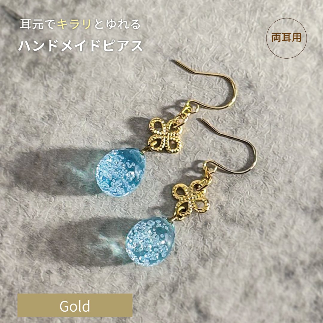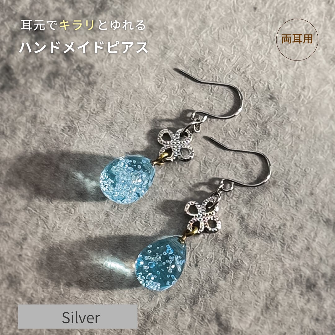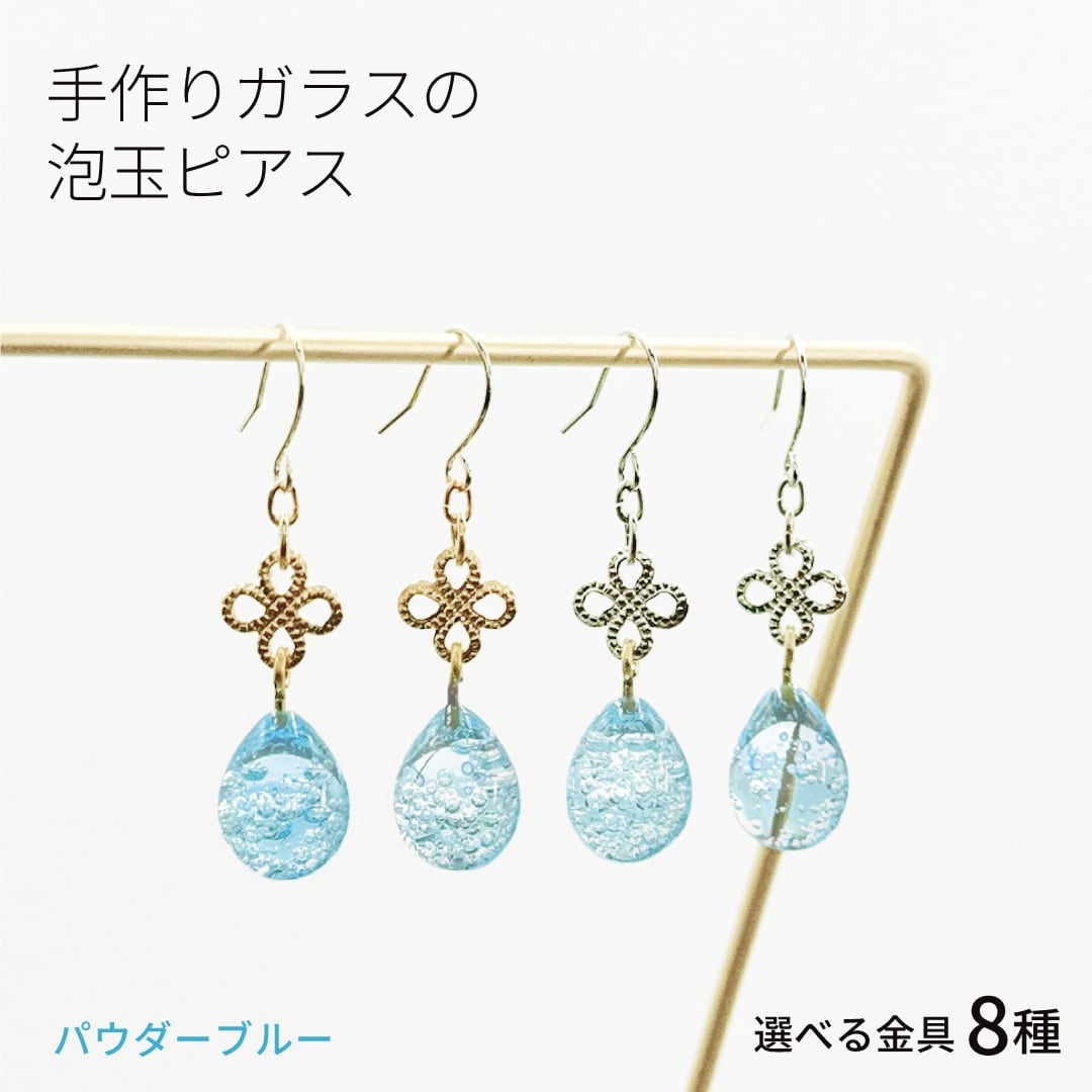 手作りガラスの泡玉ピアス パウダーブルー 金具の変更可 雫 ドロップ 揺れる 手作り