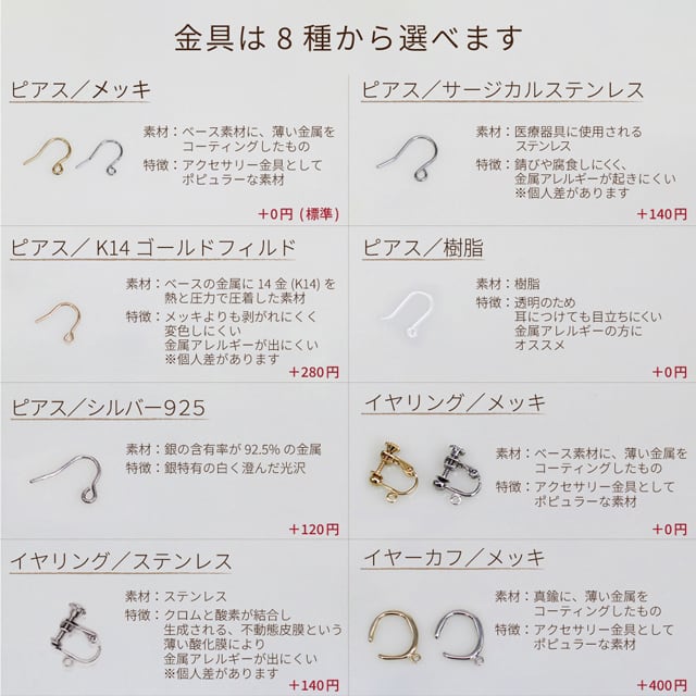 イヤリング金具、樹脂ピアスへの変更が可能なため