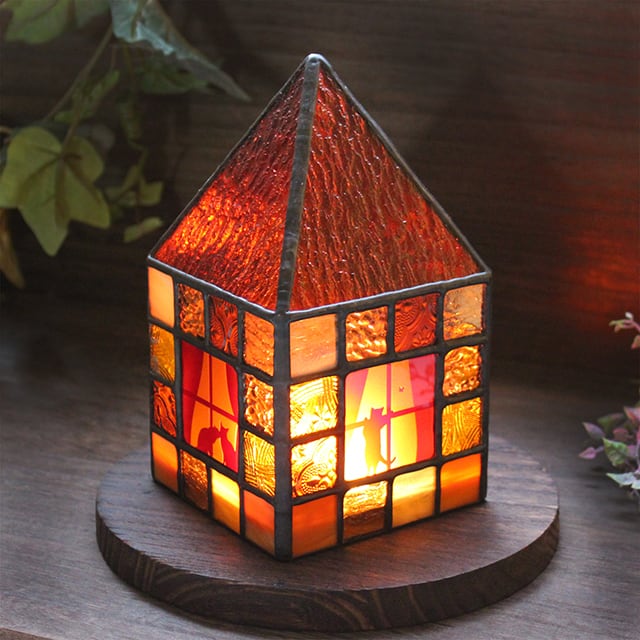 《送料無料》 【ネコがいるカラフルなお家/ダークイエロー】ステンドグラス・ランプ(LEDライト付)