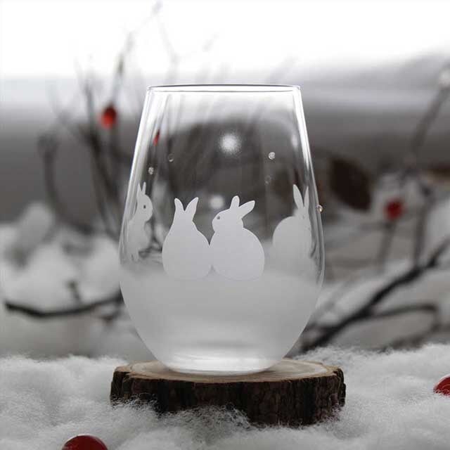 優雅な曲線のタンブラーグラスに、雪景色にいる うさぎたちをサンドブラストで彫刻しました。