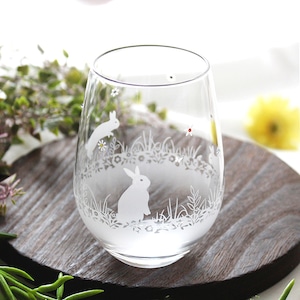 優雅な曲線のタンブラーグラスに、春の野原で楽しそうな うさぎたちをサンドブラストで彫刻しました。