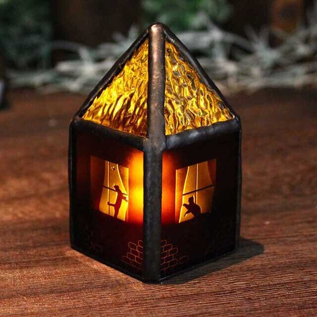 フランス製のアンティークガラスに窓とネコを彫刻加工し、ステンドグラス技法で制作した、小さなおうち形のランプです。