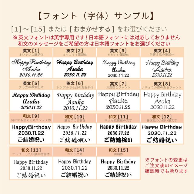 名入れは「英文」と「和文」のみ対応しています。他の言語ではお受けできませんので、ご了承ください。