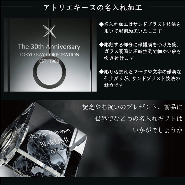 名入れ加工はサンドブラスト技法を用いて彫刻加工いたします。