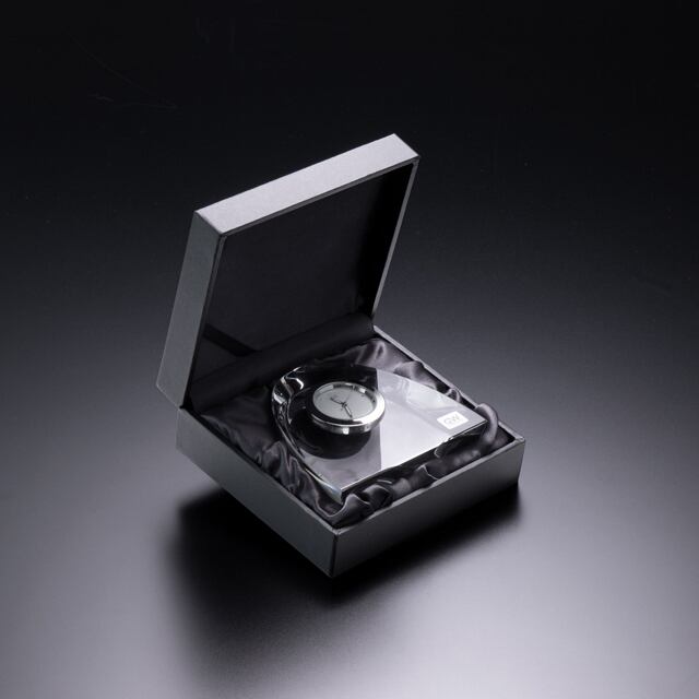 オプティカルガラス製の置時計に、お名前や記念日等を彫刻加工いたします。
