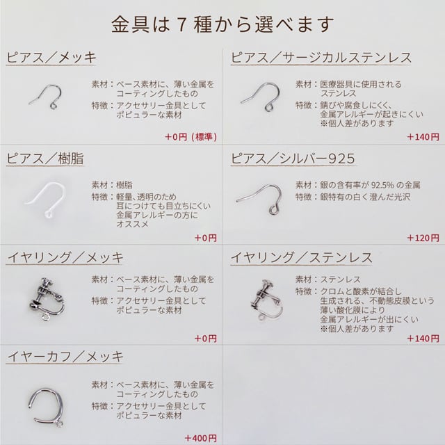イヤリング金具、樹脂ピアスへの変更が可能なため