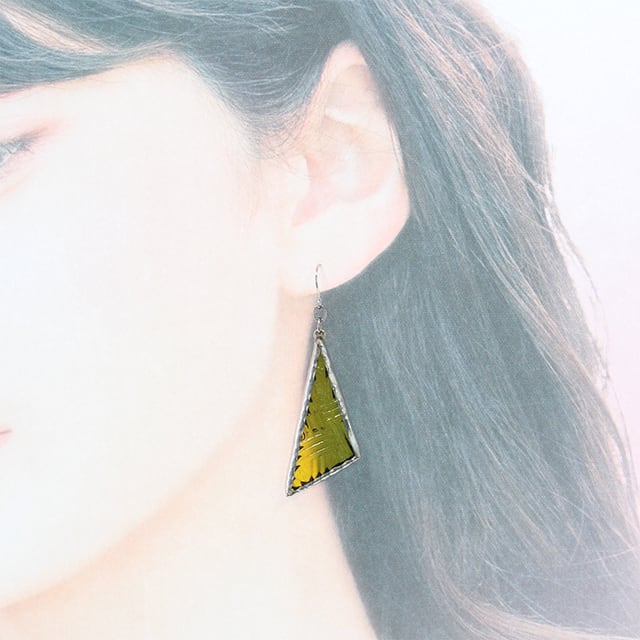 ステンドグラスの三角ピアス【柄ガラス・クロムイエロー】カラーです。