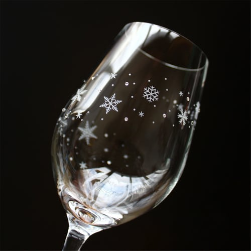 ティアドロップ形状のワイングラスに、雪の結晶が舞い流れるようなイメージのデザインを彫刻しました。