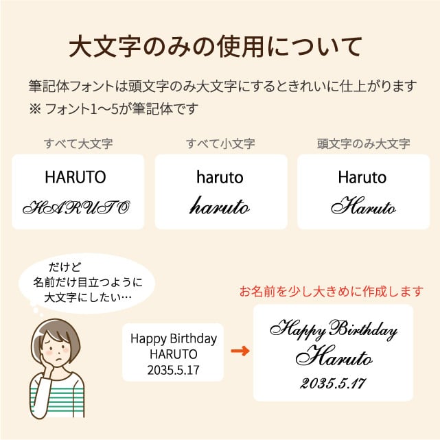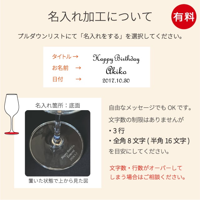 名入れの内容は「タイトル」、「お名前」、「日付」のいずれか、またはその組み合わせで対応します。