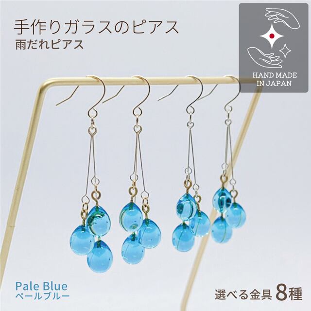 手づくりガラスの【雨だれピアス】ペールブルー バーナーワーク ドロップ しずく ★送料無料