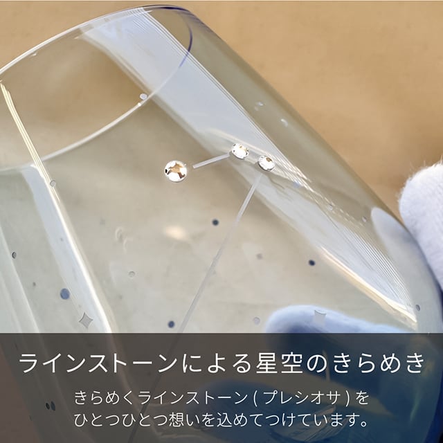 優雅な曲線が美しいタンブラーグラスの全面に、満天の星空をサンドブラストで彫刻して、12星座をひとつ ラインストーンで表現しました。