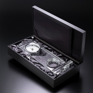 オプティカルガラス製の置時計に、お名前や記念日等を彫刻加工いたします。