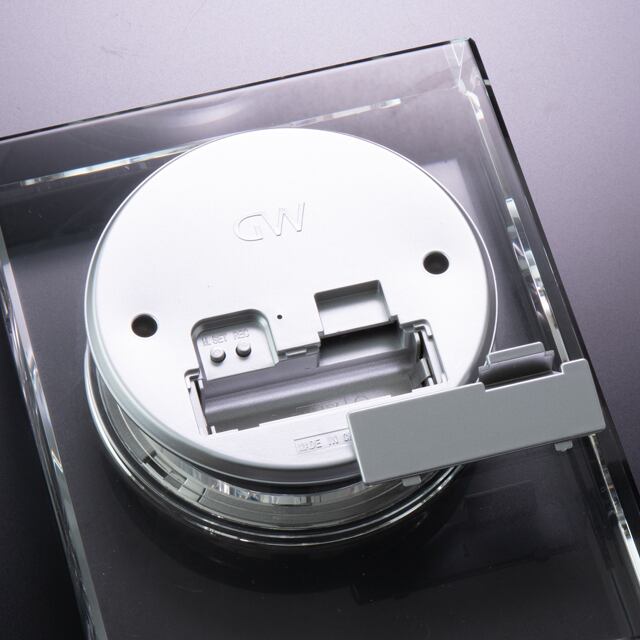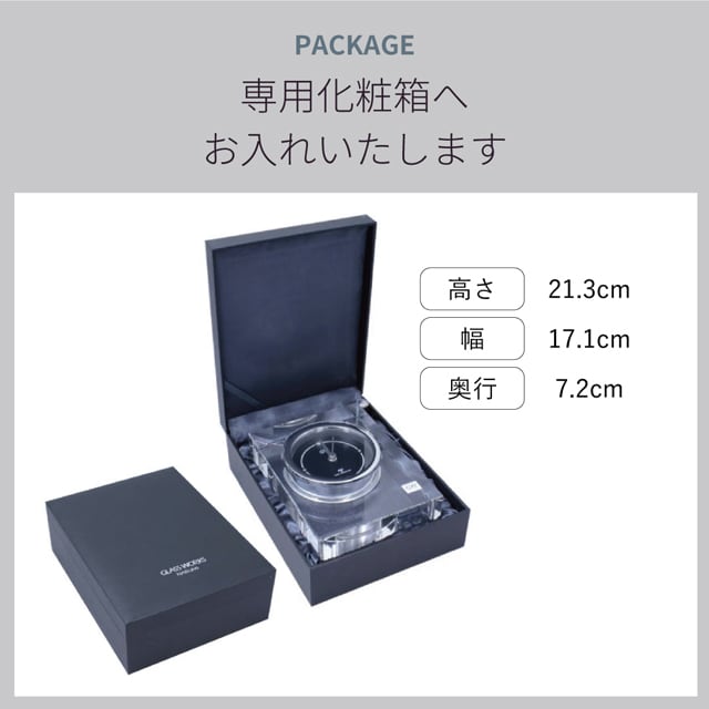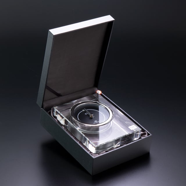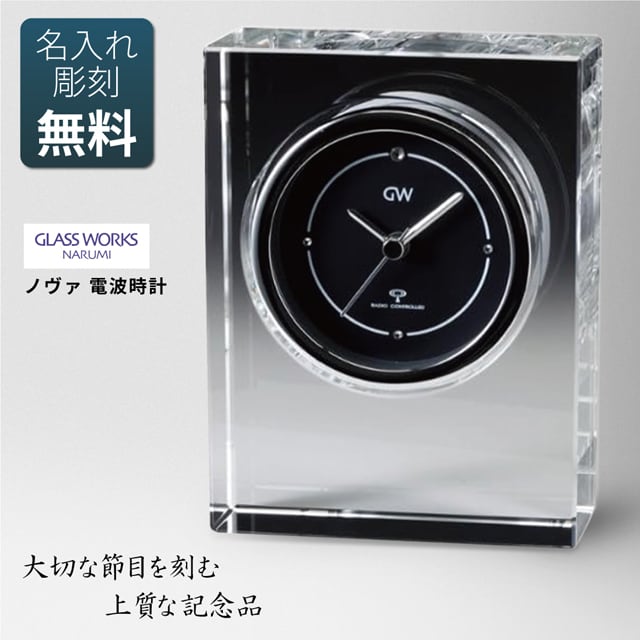 オプティカルガラス製の置時計に、お名前や記念日等を彫刻加工いたします。