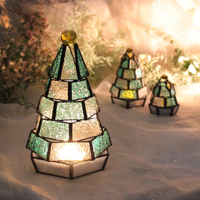 もみの木をモチーフに、ステンドグラス技法で制作したランプです。