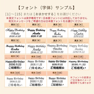 名入れの内容は「タイトル」、「お名前」、「日付」のいずれか、またはその組み合わせで対応します。