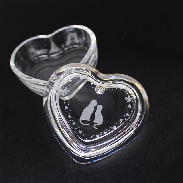 ハートのガラスケースに、猫モチーフのデザインをサンドブラストで彫刻加工して、ラインストーンを取り付けました。