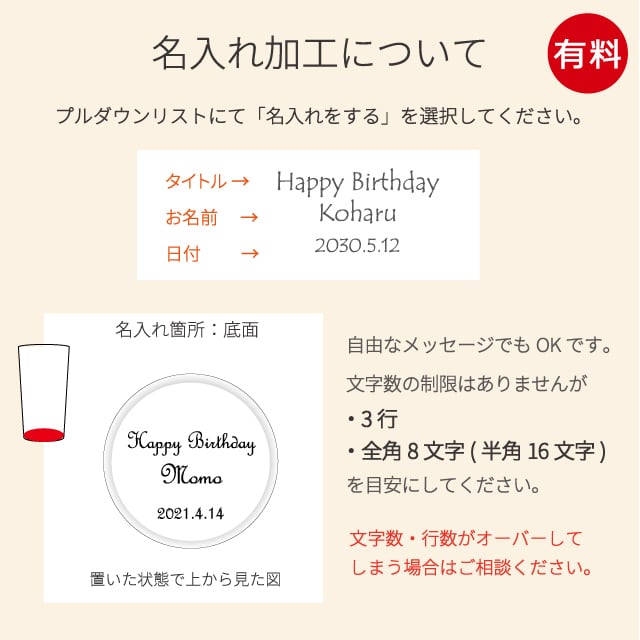 ※名入れ加工をご希望の場合、名入れイメージの確認を「希望する」を選択されますと、制作OKのご返信をいただてからの制作・発送となりますので、ご連絡のタイミングによっては発送が1~2日遅くなることもあります。ご了承ください。